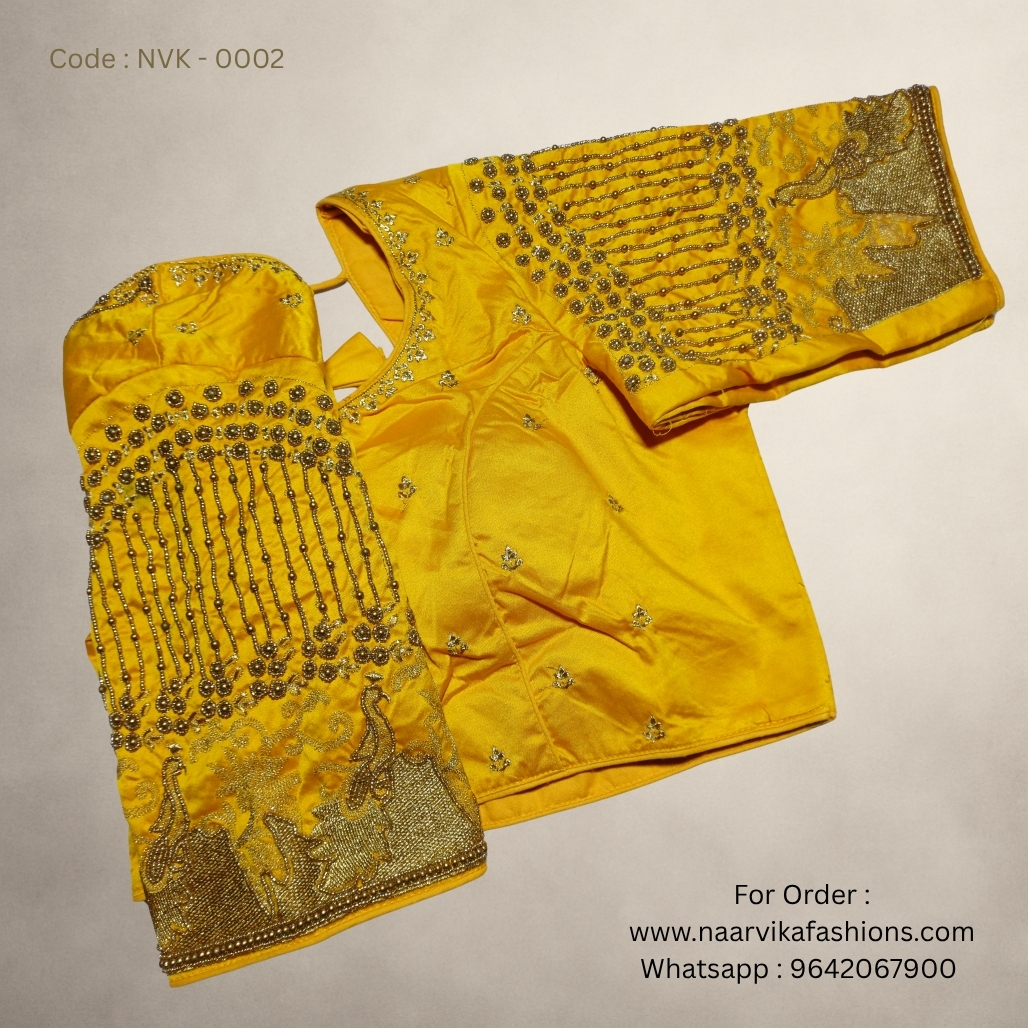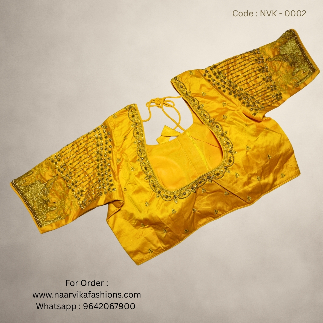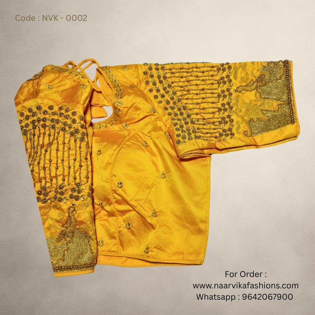This stunning maroon blouse comes with extra margins for easy size adjustments to get your perfect fit. The sleeves showcase a beautiful peacock sitting on a floral mountain design, paired with a trendy chain pattern on the upper arms. Delicate floral embroidery adds charm all over. A blend of fine aari and machine work gives it a rich, elegant look — perfect for festive and traditional occasions.