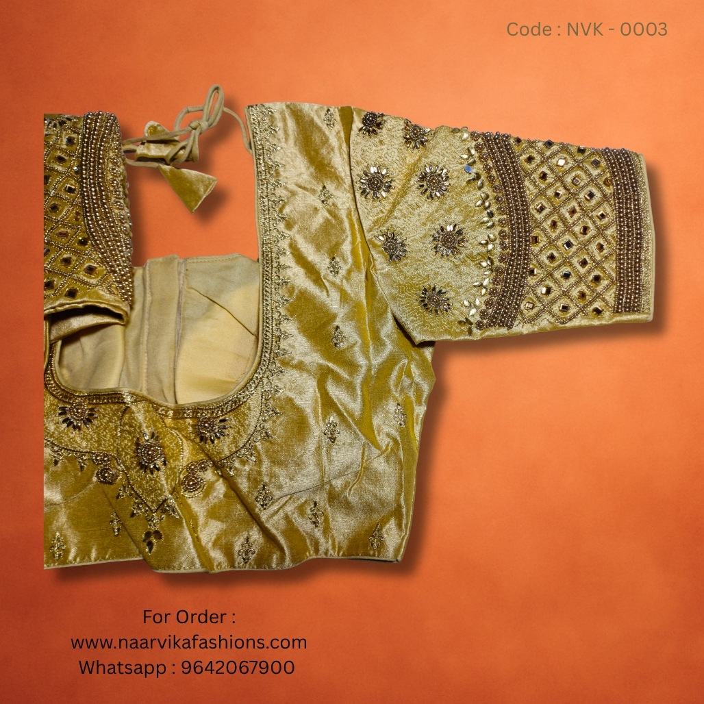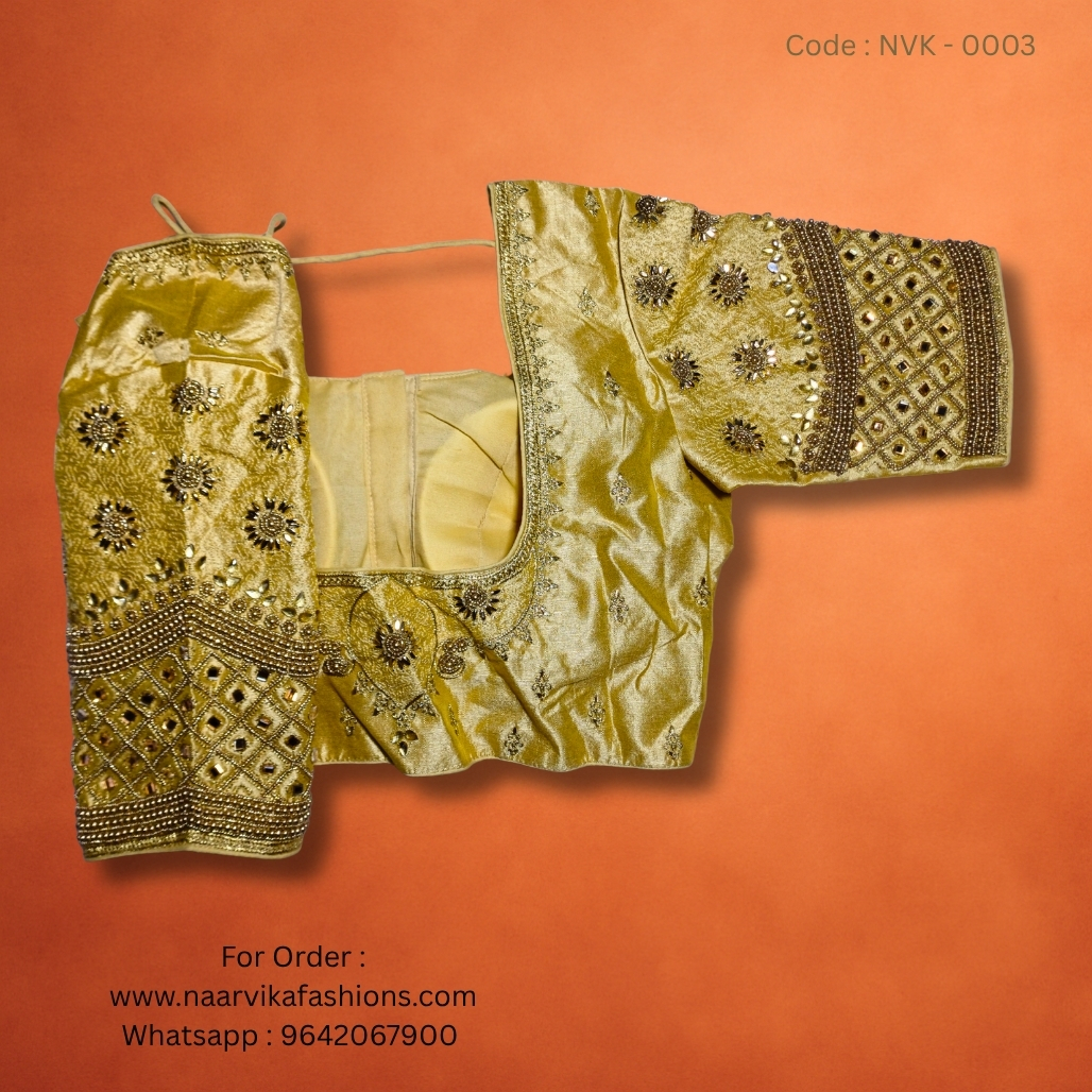 This elegant Gold blouse comes with extra margins, allowing you to alter it for a perfect fit. The sleeves are beautifully designed with floral, mango stone, and kite motifs, adding a touch of tradition. The front features detailed machine embroidery, while the back is finished with rich aari work. A graceful pick for festive events, weddings, and ethnic celebrations.