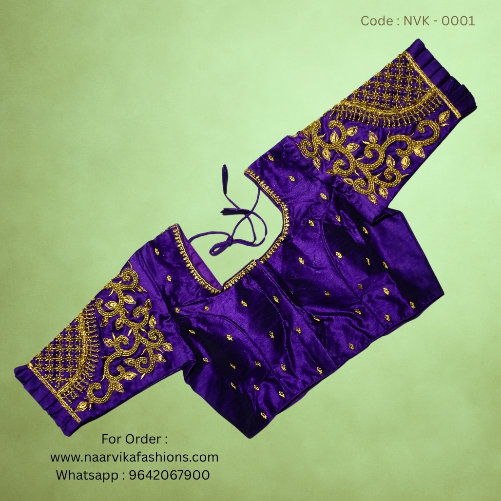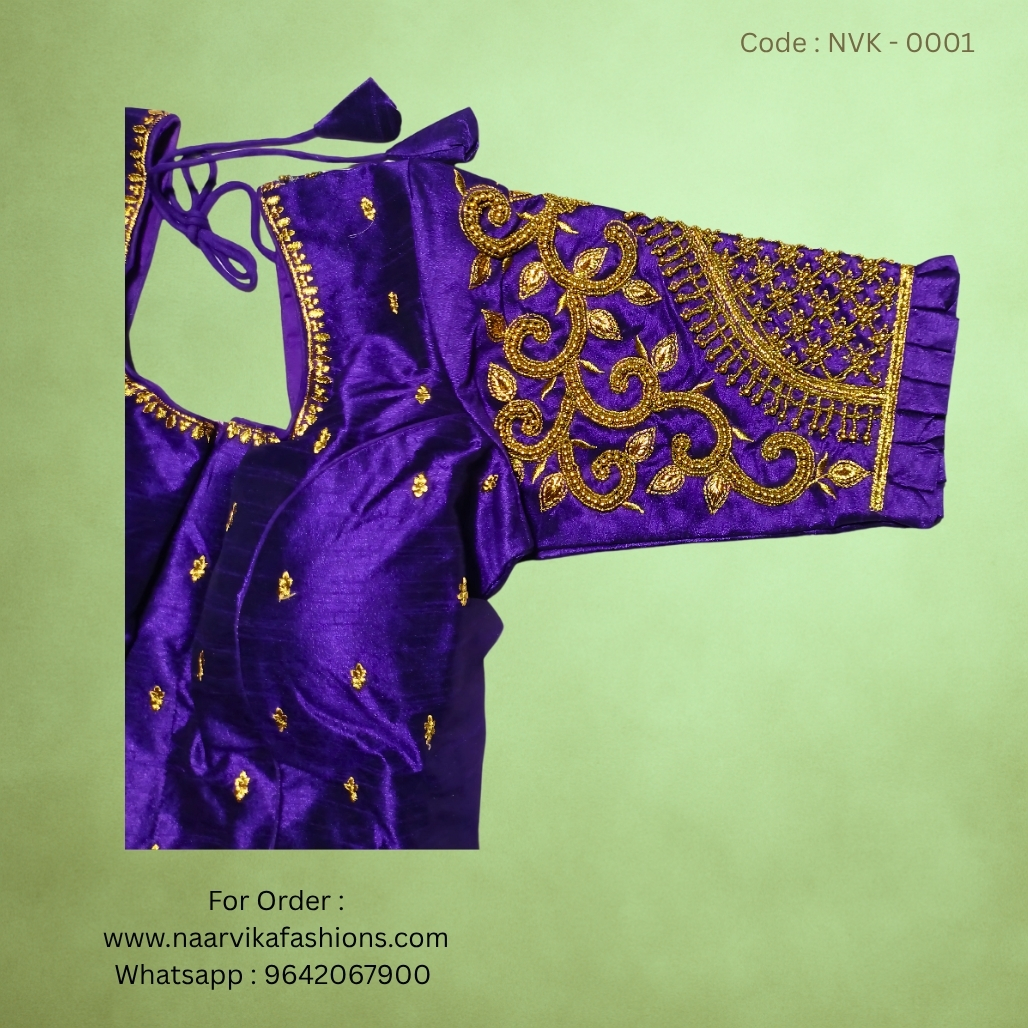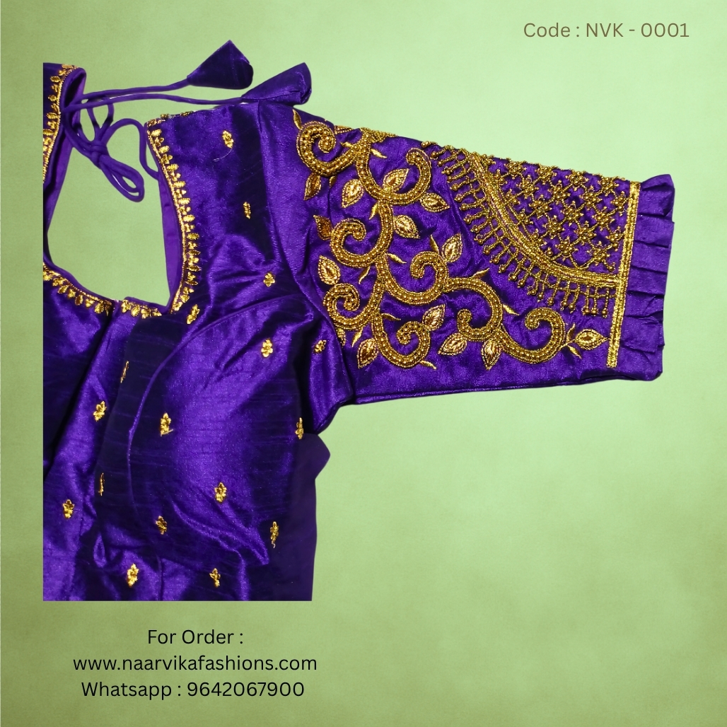 This beautiful blouse comes with extra margins, so you can alter it for the perfect fit. It features soft blended pads and trendy leaf-style sleeves. The front has fine machine embroidery, while the back shines with detailed aari work. A perfect mix of tradition and modern style – ideal for festivals, weddings, and ethnic parties.