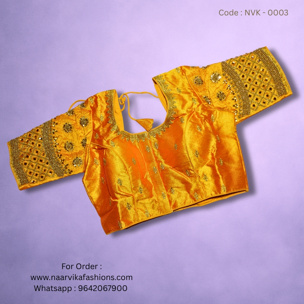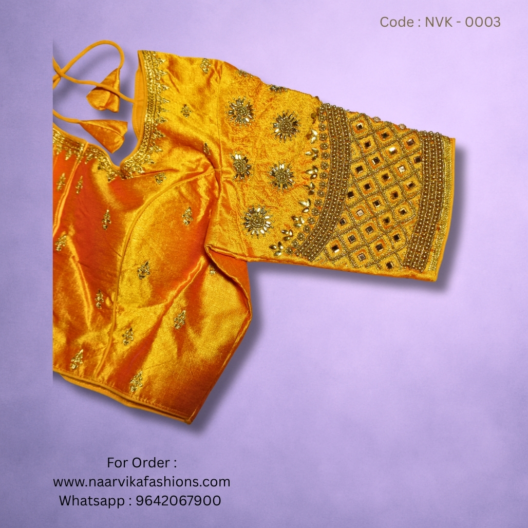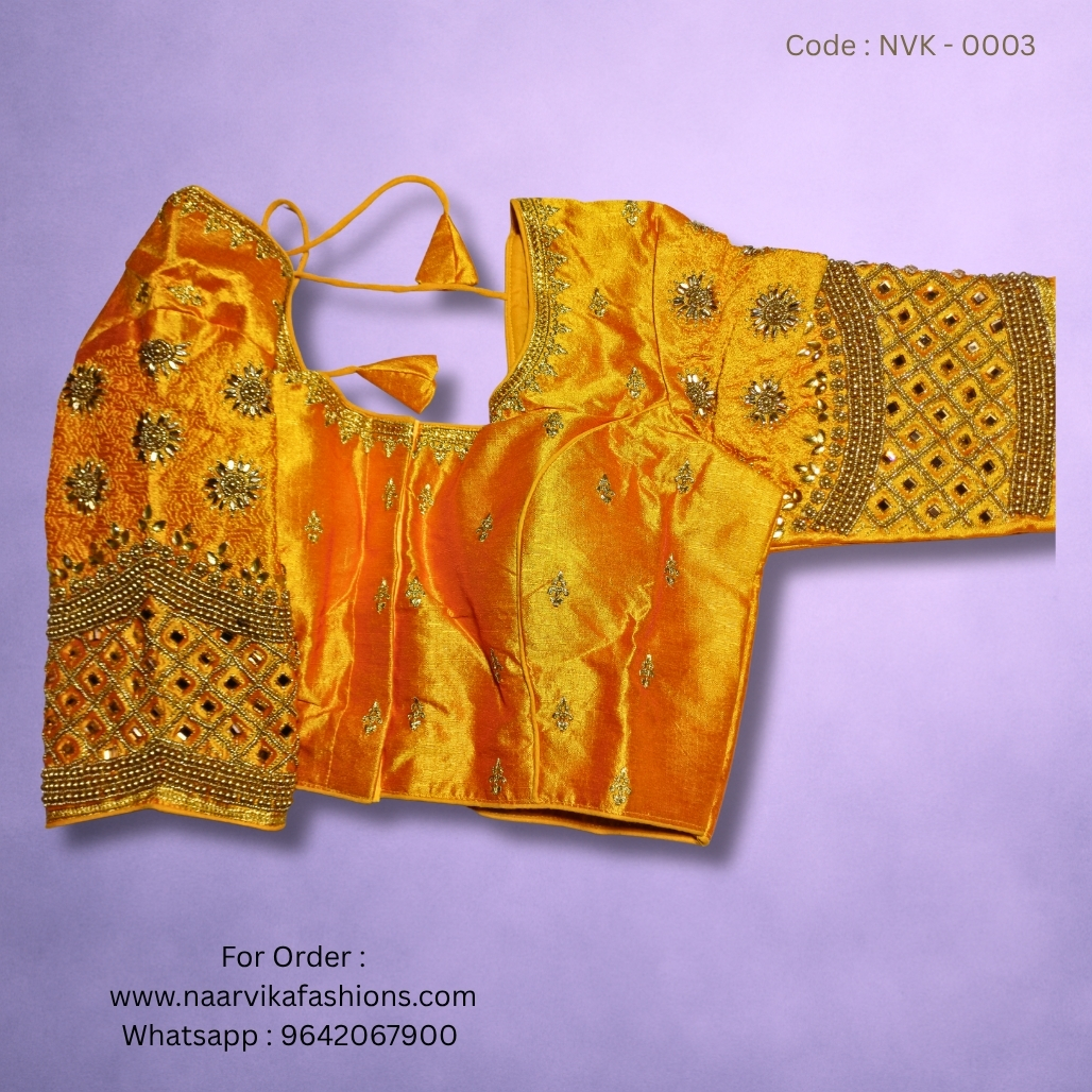 This elegant yellow blouse comes with extra margins, allowing you to alter it for a perfect fit. The sleeves are beautifully designed with floral, mango stone, and kite motifs, adding a touch of tradition. The front features detailed machine embroidery, while the back is finished with rich aari work. A graceful pick for festive events, weddings, and ethnic celebrations.